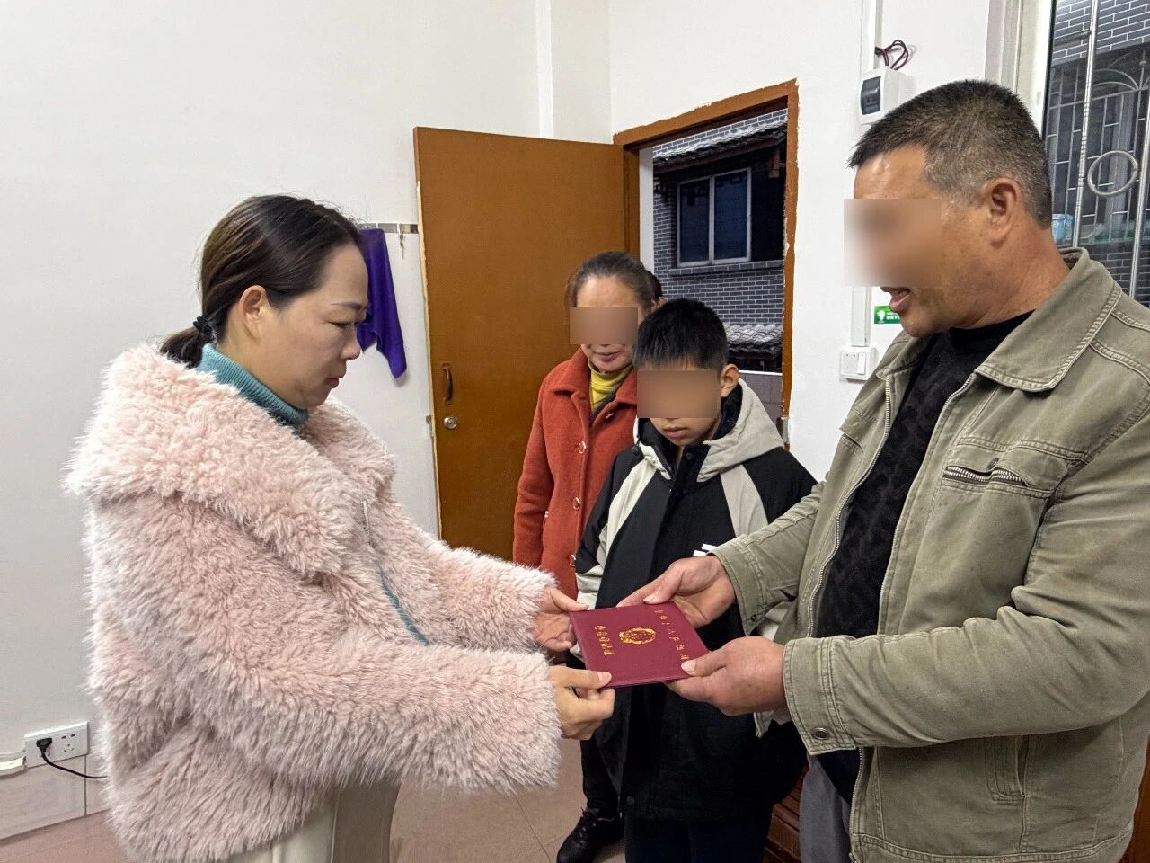 2025年12月4日,法官曾智菊(左二)一行到收养人家中了解家庭情况。