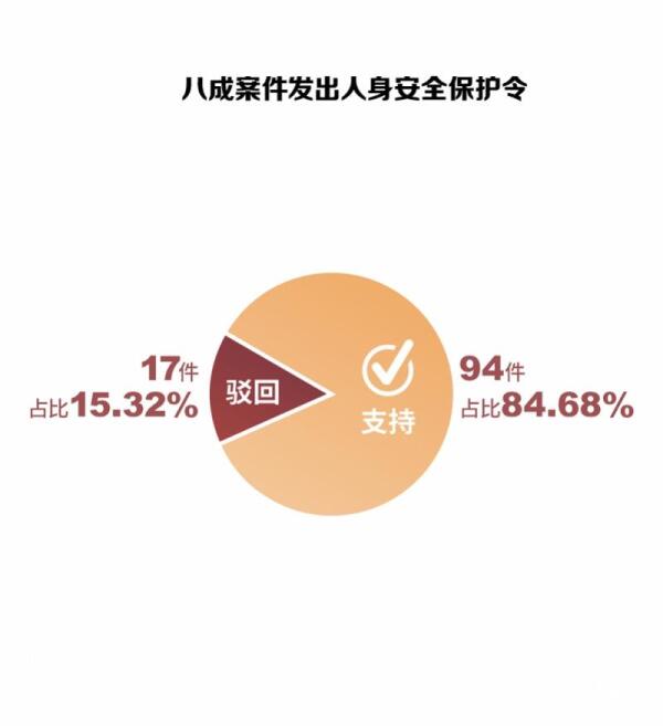 数据显示,并不是所有关于人身安全保护令的申请,均能得到法院的支持。在111件人身安全保护令案件中,有94件获得法院的支持,占比高达84.68%;仅有17件被法院驳回。