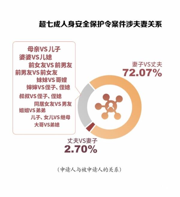 综合上述分析,由此可见,申请人身安全保护令的群体主要为31-40岁的女性。此外,南都记者对申请人与被申请人之间的关系也进行了细致划分,在111件案件中,有80件为妻子申请人身安全保护令,请求禁止丈夫对自己进行家庭暴力,这一数据占比为72.07%。