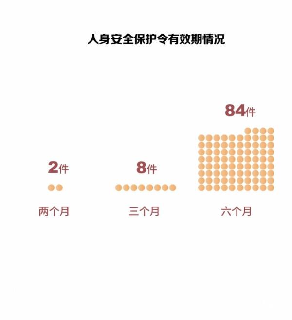 在上述94宗获得法院支持的案件中,人身安全保护令有效期为六个月的,占比89.36%,三个月的占比8.51%,两个月的占比仅为2.13%。