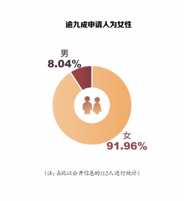 从申请人的性别来看,在111件案件中,有103名申请人为女性,占比高达91.96%,只有9人为男性。同时,从申请人的年龄来看,主要集中在31-40岁这一年龄阶段,占比为36.19%,其次为41-50岁、51-60岁、21-30岁,各自占比分别为23.81%、19.05%、10.48%(年龄以公布信息的105人进行统计)。
